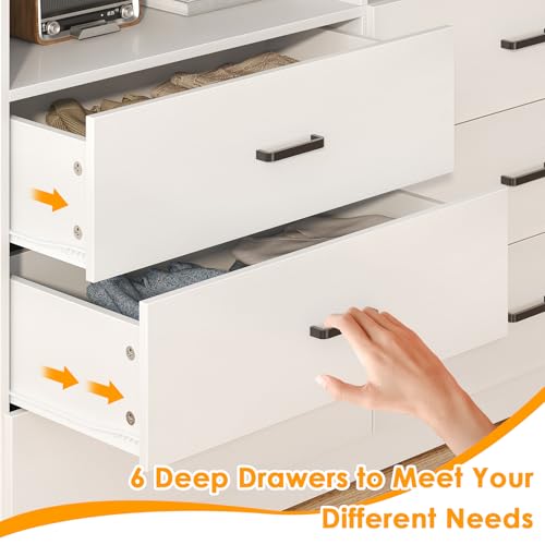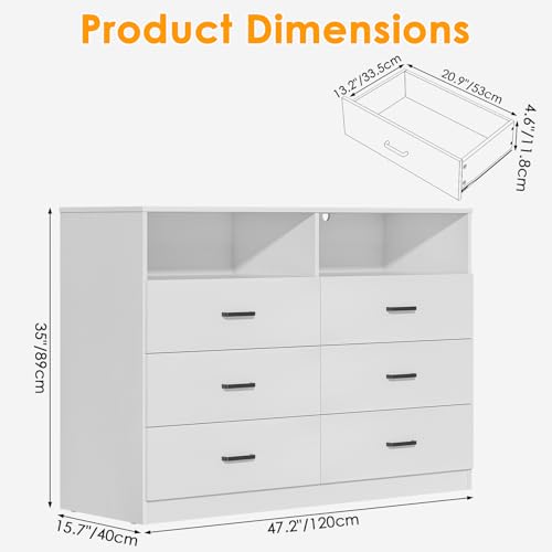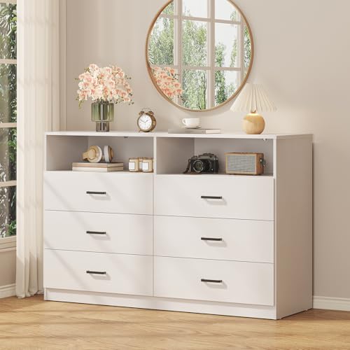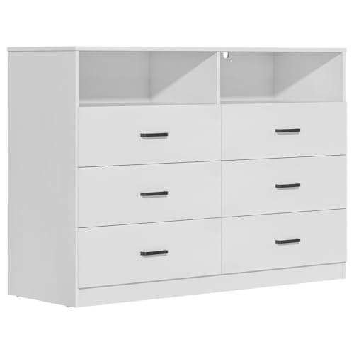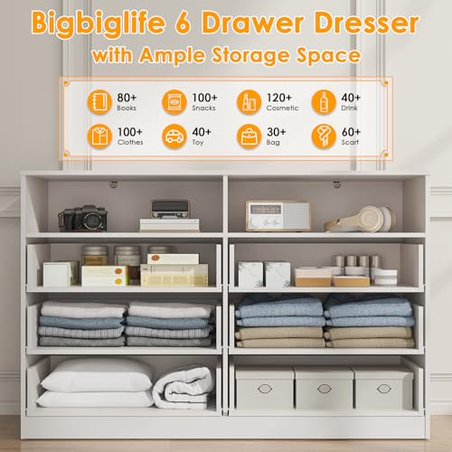 Bigbiglife - تسريحة خشبية من 6 أدراج لغرفة النوم مع رفين مفتوحين للتخزين، كومودينو منظم مزدوج عريض لغرفة النوم وغرفة المعيشة والمدخل والممر من بيج بيج لايف (أبيض)