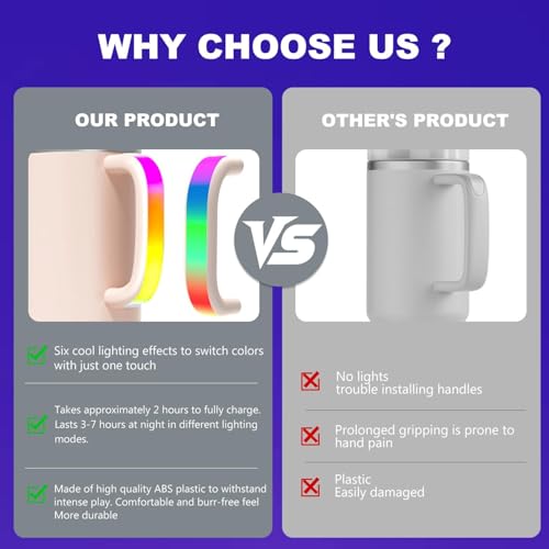 - 【مقبض مضيء】: مقبض إضاءة LED الخاص بنا متوافق مع ستانلي متوافق مع ستانلي كوينشر H2.0 (2023/2024) وبروتور - قم بترقية الكوب الخاص بك بـ 6 ألوان LED نابضة بالحياة، بما في ذلك الضوء الأبيض والفلاش وأوضاع التدرج السلس. مثالية للاستخدام الليلي ومثالية للحفلات أو التخييم أو الأفلام أو المرح اليومي!