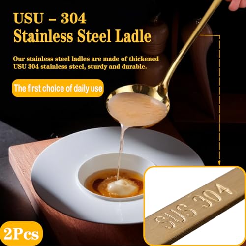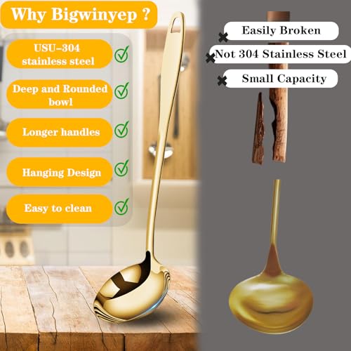 Bigwinyep - مغرفة شوربة من الفولاذ المقاوم للصدأ 304 بمقبض طويل 31 سم، ملعقة تقديم كبيرة للطبخ والبوفيه والحفلات والمطبخ من بيج وينيب، ذهبي، قطعتين