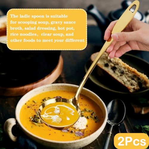 - تصميم مقبض طويل تتميز مغرفة الشورية المصنوعة من الفولاذ المقاوم للصدأ بمقبض طويل 31.2 سم لسهولة الإمساك والحماية من الحروق، خاصة عند تقديم الشوربة الساخنة أو التوابل. اللون الذهبي اللامع يضفي لمسة فريدة على مطبخك وسيُعجب أصدقاؤك بأناقتك.