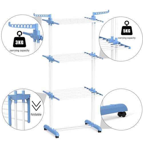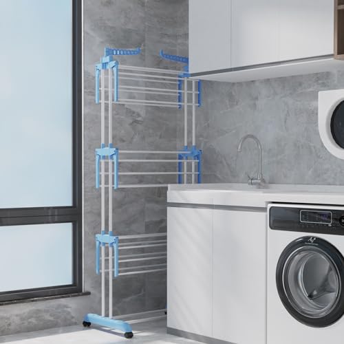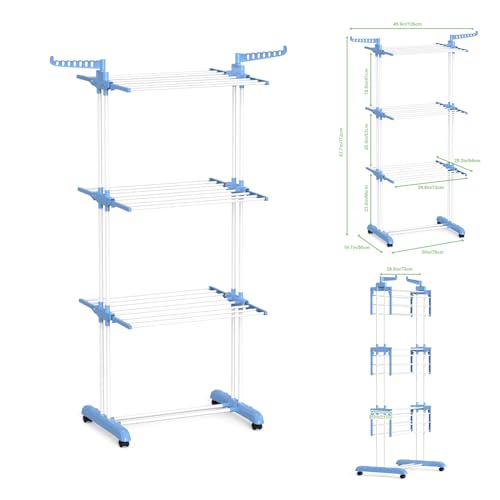 Bigzzia - منشر تجفيف ملابس قابل للطي من 4 طبقات الفولاذ المقاوم للصدأ مع جناحين جانبيين بيجزدا لون أزرق فاتح ستانلس ستيل