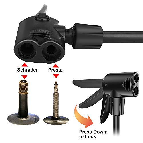 - [رأس صمام مزدوج مع قفل الإبهام] ---- مضخة قدم الدراجة مع المقياس متوافقة مع صمامات بريستا وشريدر المزدوجة. تتميز بسطح أملس وإغلاق محكم وأداء ضخ جيد. لا حاجة إلى محولات أو تعديلات، يضمن قفل الإبهام إحكام الغلق ولا تسرب الهواء.