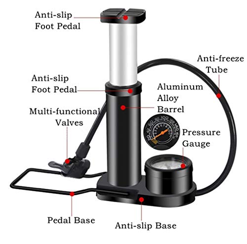 Zingso - مضخة دراجة تعمل بالقدم مع مقياس ضغط، صمام بريستا وشرادر عالمي، إسطوانة من خليط معدني من الألومنيوم، منفاخ هواء صغير ومحول لإطار الدراجة مع إبرة غاز مجانية للكور (لون أسود)