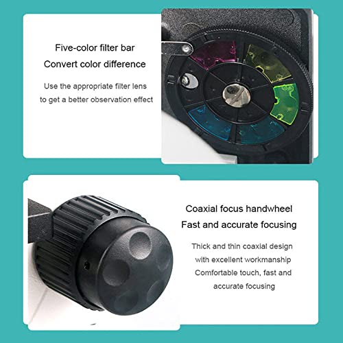 - 【نظام تركيز فائق الدقة】نظام التركيز هو نظام تركيز محوري سميك ورفيع مع آلية رف وترس. يسمح لك نظام التركيز المحوري الخشن والدقيق بأداء وظيفتين من التركيز الخشن والتركيز الدقيق دون تحريك يديك إلى وضع مختلف. توفر إضاءة LED علوية وسفلية مدمجة قابلة للتعديل سطوعًا.