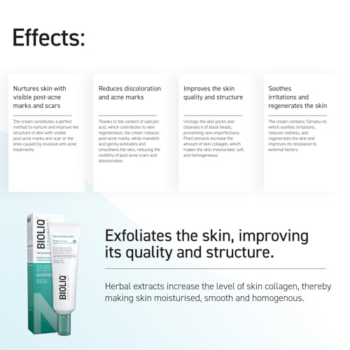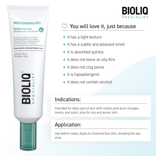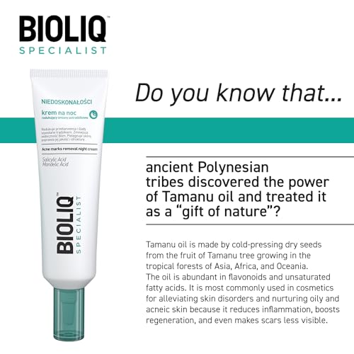 BIOLIQ - كريم ليلي متخصص في إزالة علامات حب الشباب، مع حمض الساليسيليك وحمض الماندليك وزيت تامانو، يقلل من الندوب وتغير اللون من بايوليك - 30 ملليلتر