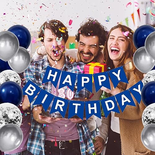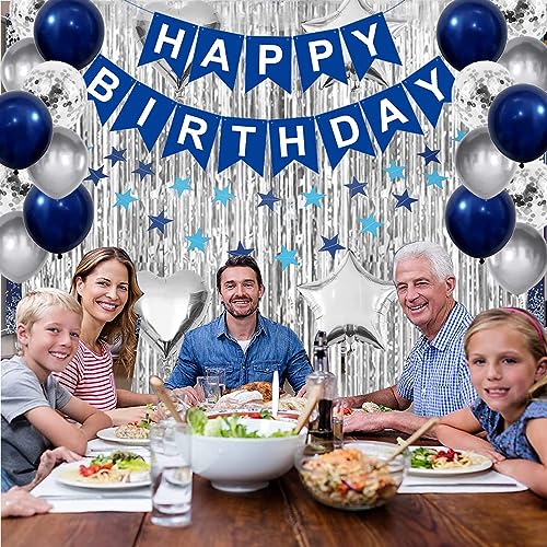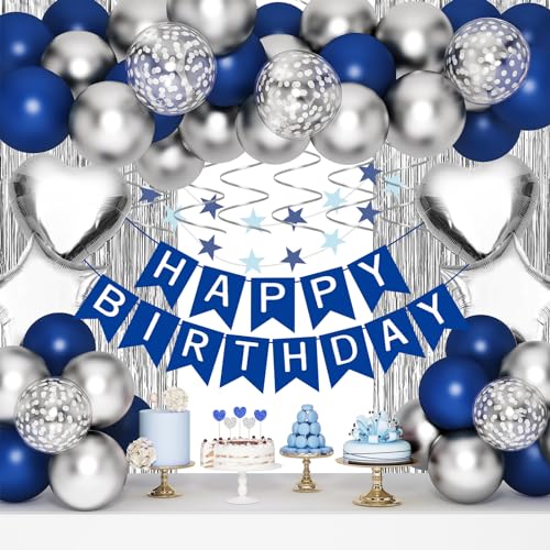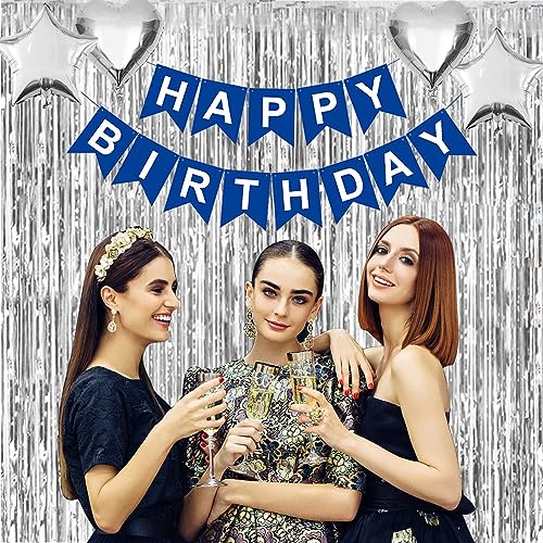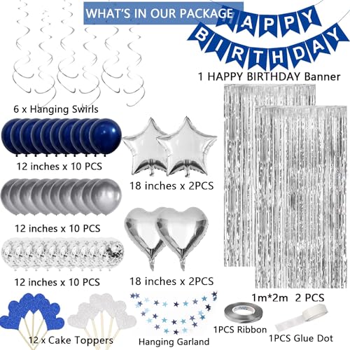 - [ديكورات عيد ميلاد للرجال والنساء] مجموعة زينة عيد الميلاد هذه ذات الجودة الزرقاء والفضية التي تشمل: لافتة عيد ميلاد سعيد، قطعتان من ستائر الحفلات بشراشيب، 10 قطع من بالونات القصاصات الورقية، 10 قطع فضية معدنية، 10 بالونات زرقاء كحلية، 4 قطع من بالونات الفويل الفضية (قلب ونجمة)، 6 قطع دوامات فضية معلقة، 1 قطعة إكليل نجمة زرقاء، 12 قطعة علوية للكب كيك 1 قطعة الشريط / غراء منقط.
