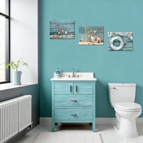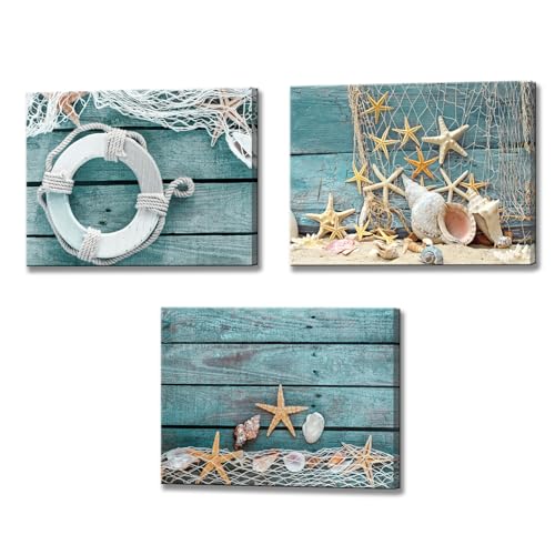 - تابلوه كانفاس للحائط برسومات مطبوعة توحي بطبيعة شاطئ من صدفة ونجمة بحر تستند على لوح ذو لون ازرق مخضر، بتصميم جاهز للتعليق لديكور حائط المنزل والمطبخ والحمام غرفة المعيشة، مكون من 3 قطع من بيوتياوال