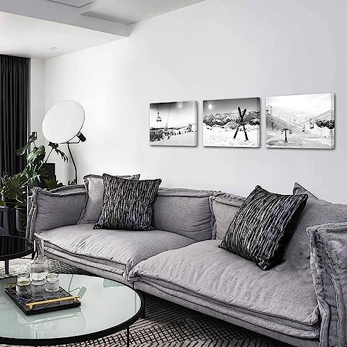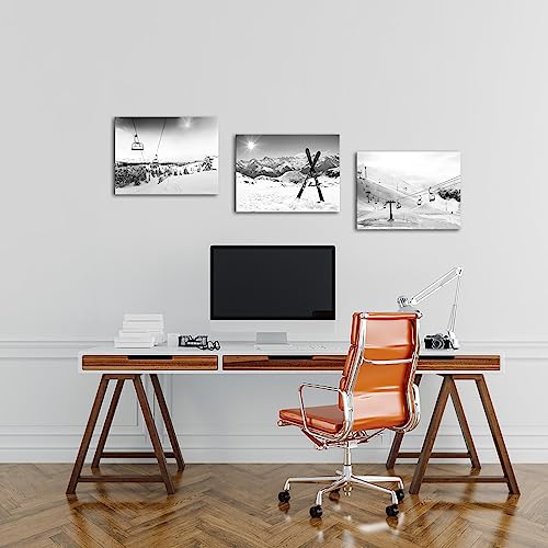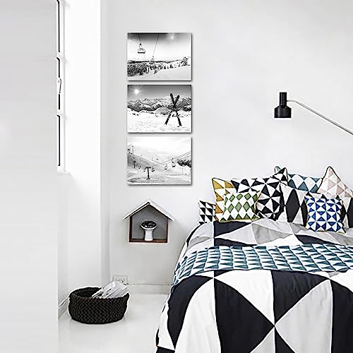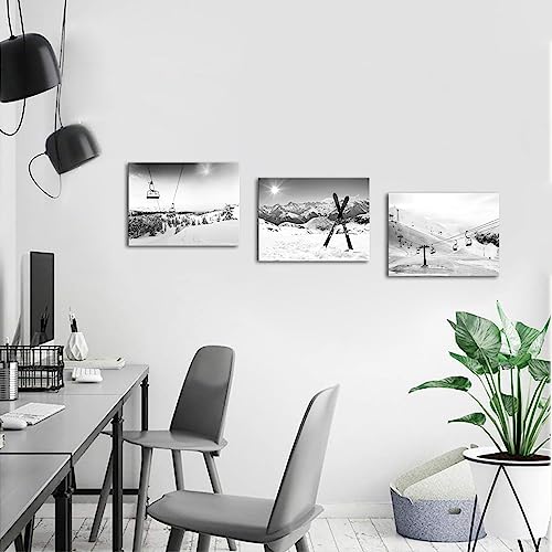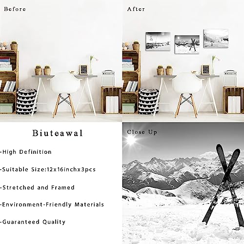 Biuteawal - بيوتياوال لوحة فنية جدارية قماشية للتزلج على الجليد بلون ابيض واسود من 3 قطع لوحات التزلج في الشمس والجبال الثلجية والشتاء اعمال لديكور المنزل وغرفة المعيشة النوم مؤطرة جاهزة