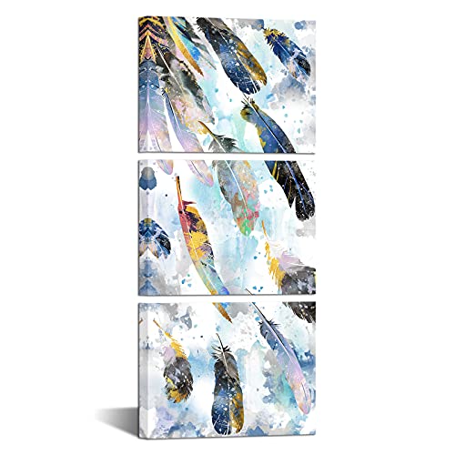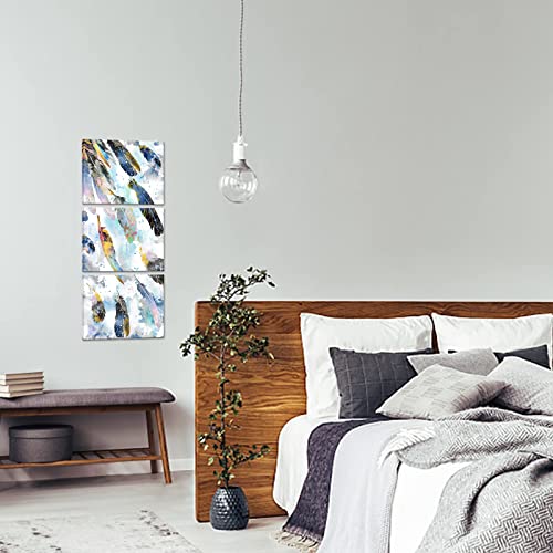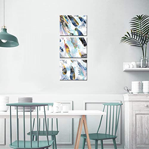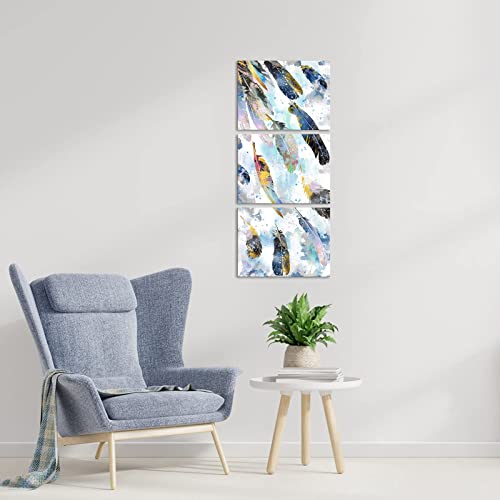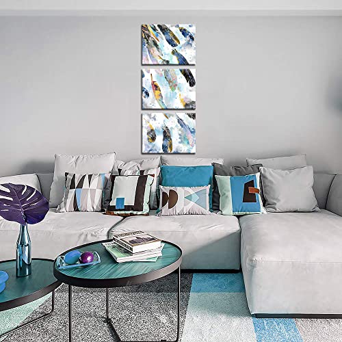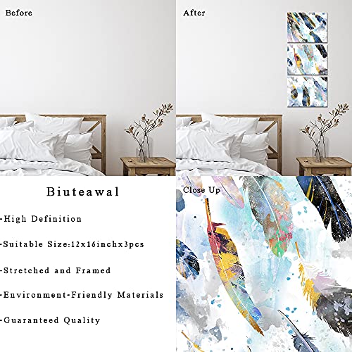 Biuteawal - بيوتياوال لوحة فنية جدارية من قماش الريش لغرفة المعيشة وغرفة النوم، صورة ريش بالوان مائية زرقاء مطبوعة 3 قطع، لوحة فنية تجريدية مؤطرة للمنزل والمكتب والحمام جاهزة للتعليق