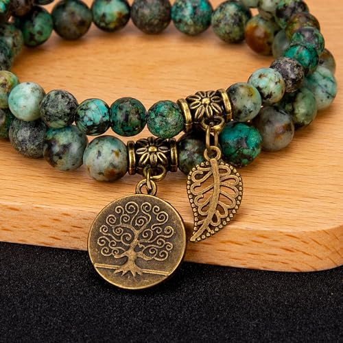 Bivei - بيفي اساور خرز من الاحجار الكريمة الطبيعية شبه الثمينة للنساء - سوار قابل للتمدد بتعليقة شجرة الحياة واوراق الشاكرا العلاجية من كريستال الفيروز الافريقي، 8 انش (تركواز افريقي)