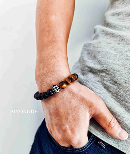 BIYONGDE - سوار سلسلة خرز اسود 10 ملم مع دلايات من الستانلس ستيل، قابل للتمدد، صلاة، حجر، اونيكس، للنساء