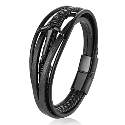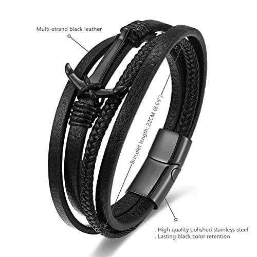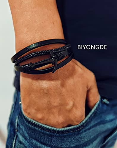 BIYONGDE - سوار جلدي مضفر للرجال والنساء من بيونجدي، بنمط كلاسيكي ولون اسود، بدلاية على شكل مرساة بحرية, 8.66 inches, جلد