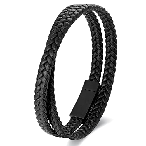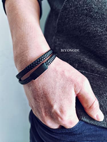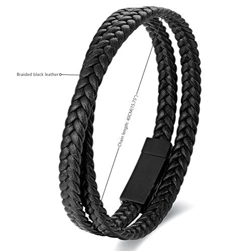 BIYONGDE - سوار جلدي مضفر اسود مصنوع يدويا باللون البني سوار بابزيم غلق مغناطيسي اسود من الستانلس ستيل، بتصميم انيق للرجال, ستانلس ستيل جلد, بدون أحجار كريمة
