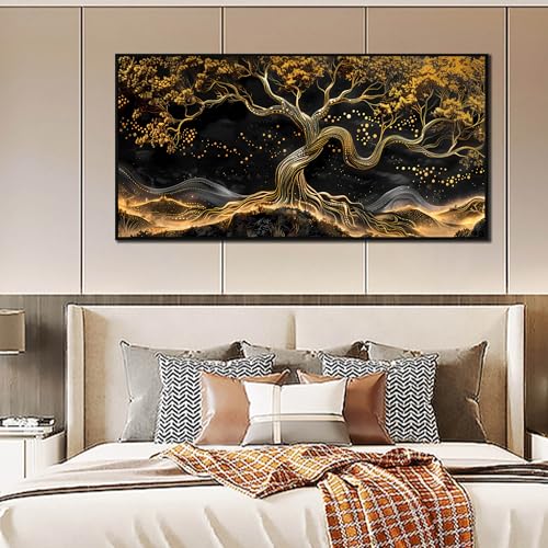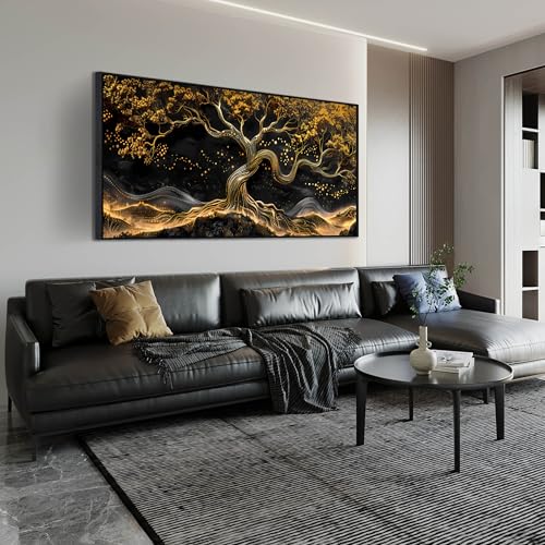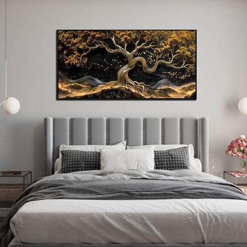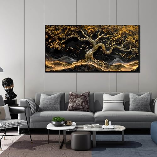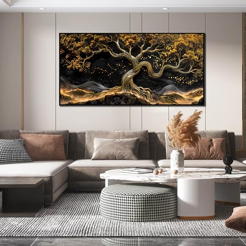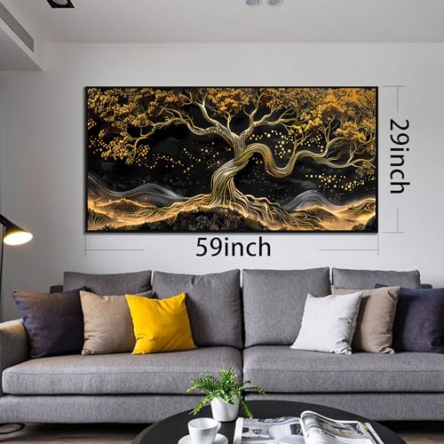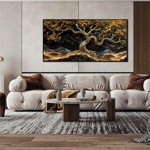 JKWALL77 - لوحة فنية جدارية من القماش الأسود والذهبي لغرفة المعيشة - ديكور حائط شجرة لغرفة النوم - لوحة فنية جدارية عصرية كبيرة باطار للمكتب مقاس 73 سم × 1.5 م