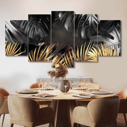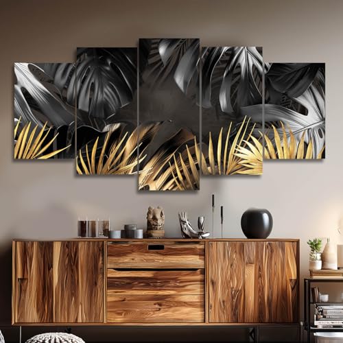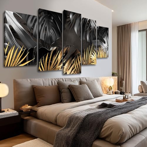 VAYIMDH - ديكور حائط بلوحة أوراق شجر سوداء وذهبية لغرفة المعيشة، فن قماشي طبيعي عمل فني عصري، مطبوعات بإطار لغرفة نوم المنزل، بوستر صور من 5 قطع جاهزة للتعليق