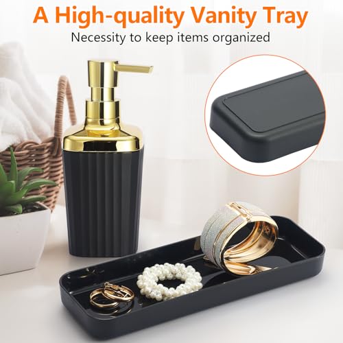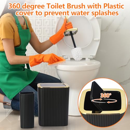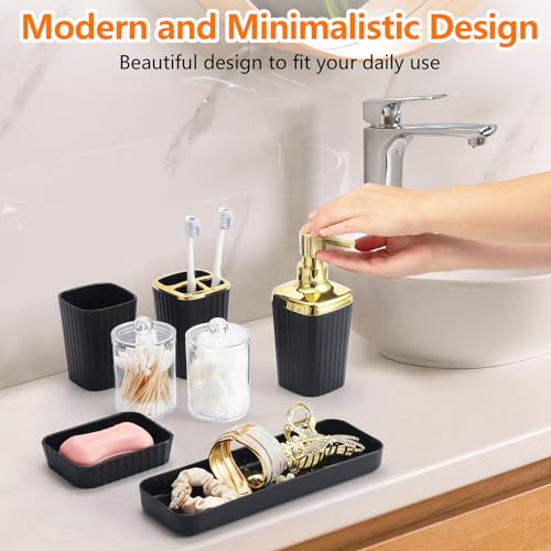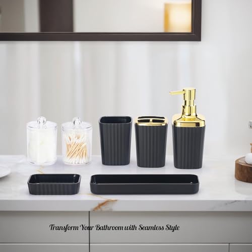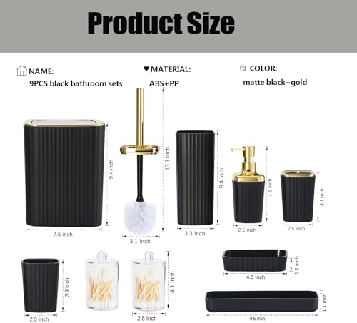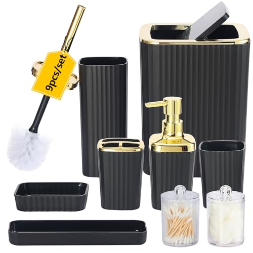 Viowil - اكسسوارات حمام، يشمل حامل فرشاة أسنان، سلة قمامة، موزع صابون سائل، كوب فرشاة أسنان، صينية للزينة، صبانة، فرشاة مرحاض، وحامل أعواد قطن، أسود، طقم 9 قطع