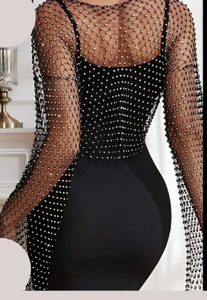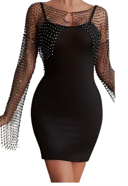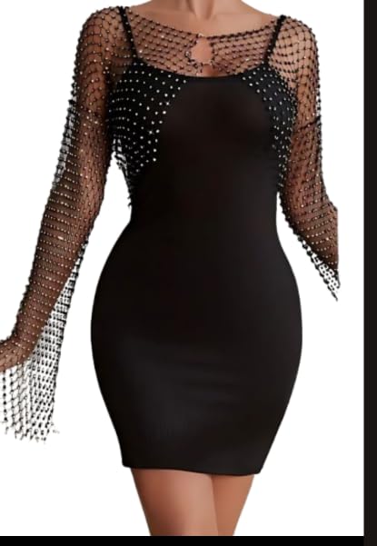Generic - فستان ضيق قصير اسود باكمام شبكية مرصعة باحجار الراين وتفاصيل شراشيب، بوليستر سباندكس، مقاس واحد