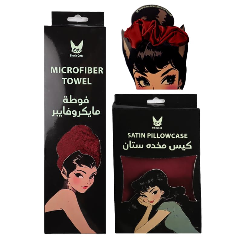 BLACK CAT - مجموعة مكونة من فوطة مايكروفايبر وكيس مخدة ساتان وتوكة شعر ساتان من بلاك كات، لون بورجندي