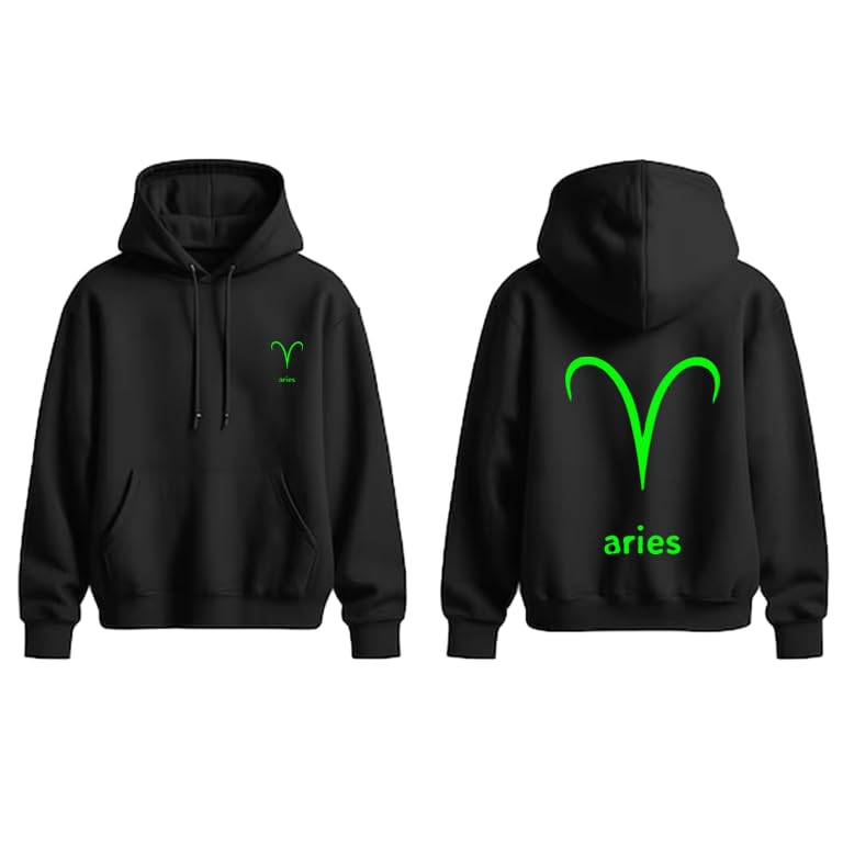 Generic - هودي قطن اسود مع شعار برج الحمل بلون اخضر ليموني مقاس (S)