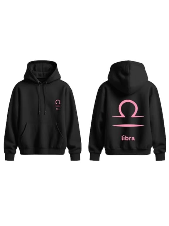 Generic - سويت شيرت بغطاء للرأس من القطن مع شعار برج الميزان وكلمة «libra» بلون وردي - لون أسود - مقاس ميديوم (M)