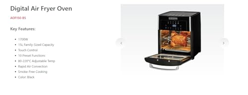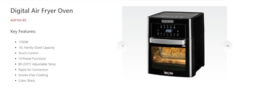 BLACK+DECKER - بلاك+ديكر فرن مقلاة هوائية رقمي، حجم عائلي 15 لتر، تحكم باللمس، 1700 واط، 10 وظائف مضبوطة مسبقا، تحكم في درجة الحرارة 80-220 درجة مئوية، الحمل الحراري السريع، طهي بدون دخان، موديل AOF150-B5، اسود