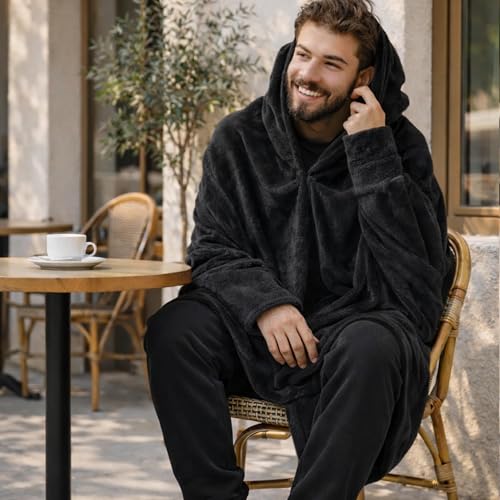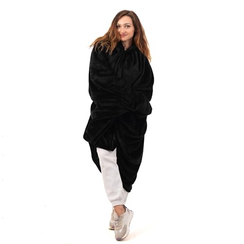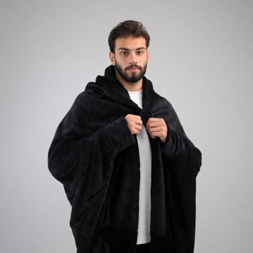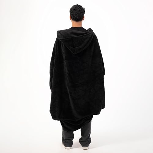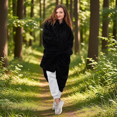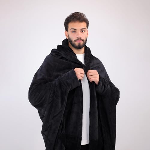 Generic - بطانية قابلة للارتداء من الصوف الاسود - تصميم كبير مع قبعة واكمام طويلة، مقاس واحد يناسب الجميع مصنوعة من مادة فائقة النعومة للحصول على أقصى قدر من الدفء والراحة، مثالية للراحة المنزلية او السفر.