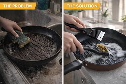 - تحتوي كل فرشاة على حافة مكشطة مدمجة من الستانلس ستيل تزيل بفعالية جزيئات الطعام المحترقة قبل تنظيف الأسنان، مما يقلل من الحاجة إلى التنظيف المفرط والحفاظ على سلامة أسطح أواني الطهي الحساسة.
