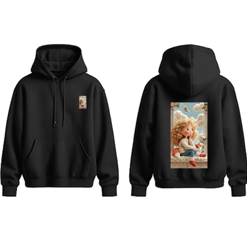 Generic - هودي اسود مع طباعة جرافيك ملاك، جيب امامي، غطاء راس برباط سحب مقاس (L)