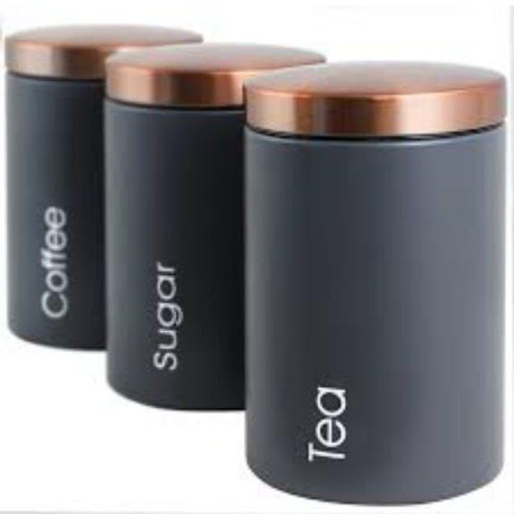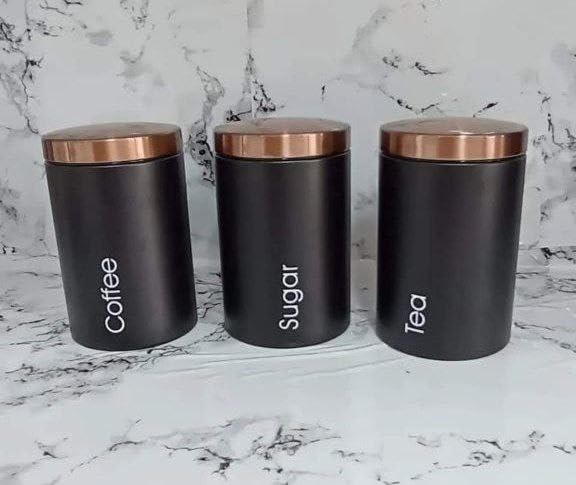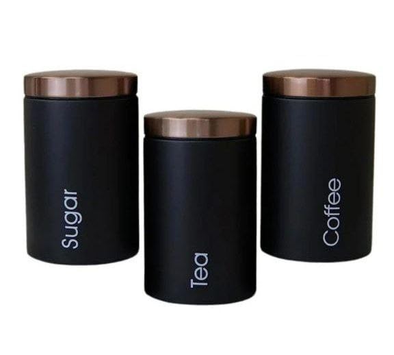 Generic - مجموعة حاويات تخزين المطبخ الأسود، أوعية تخزين القهوة والسكر والشاي مع أغطية نحاسية، 3 قطع