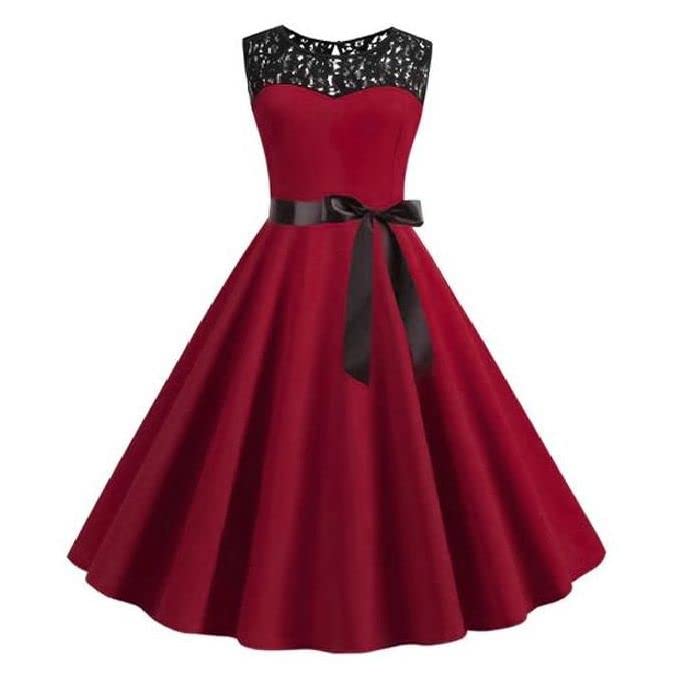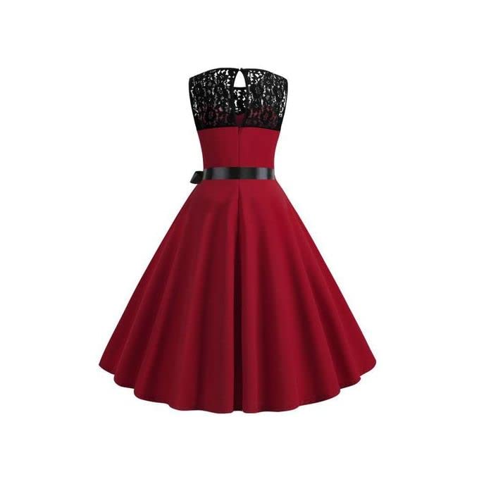 Generic - فستان اسود من الدانتيل للنساء مطرز بلون النبيذ وحزام الساتان باللون الاسود