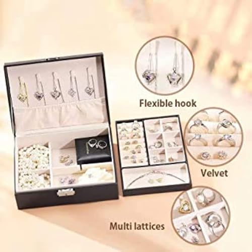Generic - صندوق جلد منظم للمجوهرات مع قفل، صندوق سفر بطبقتين قابلين للإزالة، لتخزين السلاسل والخواتم والحلقان والاساور، اسود