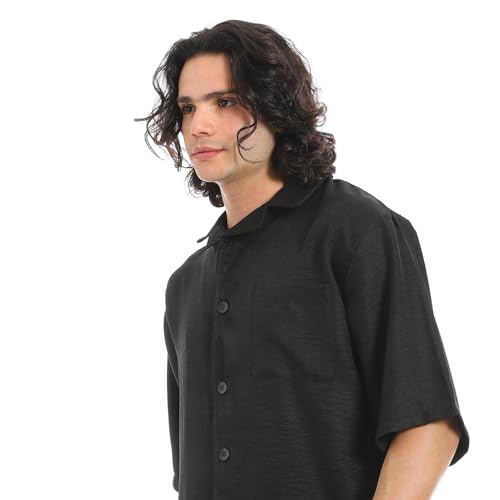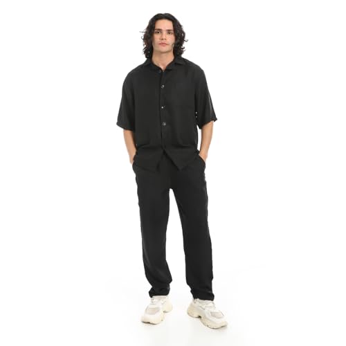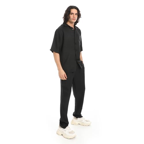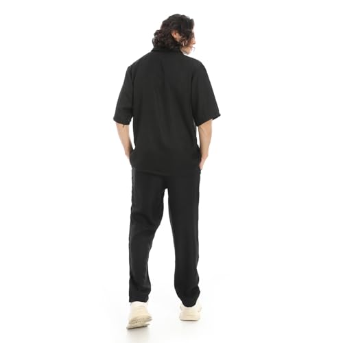 Red Circle - طقم قميص وبنطلون بياقة مطوية لاسفل من الكتان الاسود للرجال