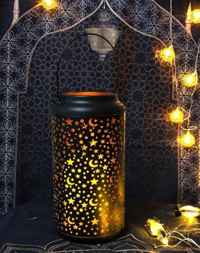- تصميم مميز: مصباح معدني أسود مزين بنقوش جميلة للنجوم والأهلة، يضيف لمسة سحرية للديكور المنزلي