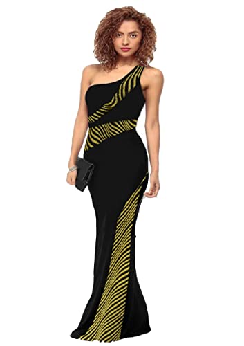 Generic - فستان سهرة اسود بكتف واحد مزين بتطريز باللون الذهبي, هيرنفي, XL، للنساء