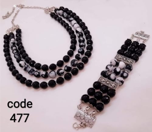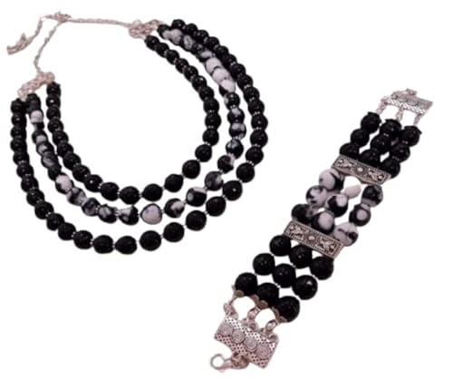 Generic - طقم نسائى عقد واسواره متعدد الادوار من الاونيكس الاسود والعقيق الطبيعى ميكس الابيض والاسود، للنساء