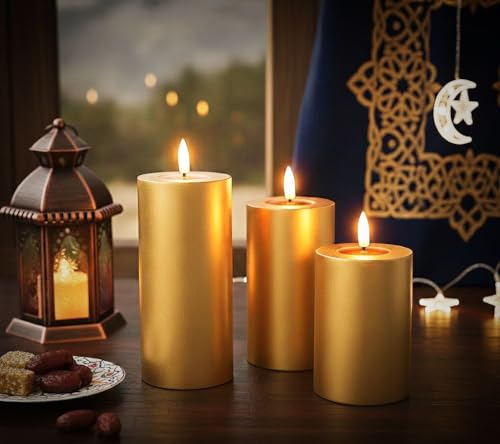 Generic - شمعة أسطوانية سوداء، مجموعة 3 قطع، أحجام متعددة 10×7 سم، 12.5×7 سم، 15×7 سم، ديكور منزلي (ذهبي)