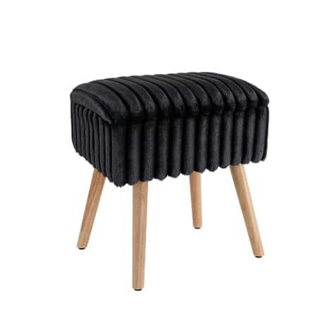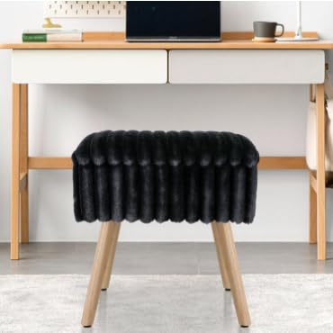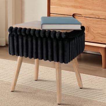 Generic - مسند قدم من الفرو الصناعي المضلع بلون اسود، مسند قدم من قماش تيدي المنسوج المعاصر، مقعد فانيتي عصري مع مساحة تخزين مخفية وارجل خشبية مدببة