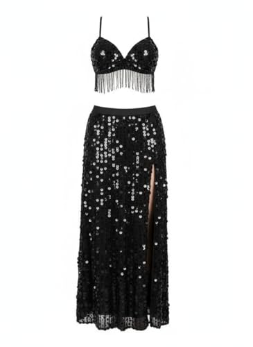 generic - طقم زي رقص شرقي موديل 1994 مزين بترتر أسود وشراشيب، مقاس واحد، قطعتان