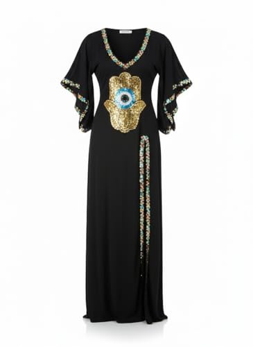 Generic - فستان أسود طويل مزين بالترتر، تصميم عين الحسد الذهبية، أكمام مكشكشة