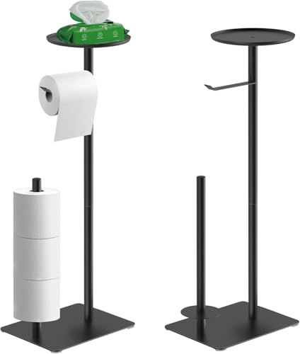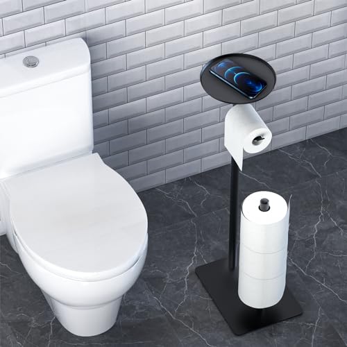 Bathola - حامل ورق تواليت اسود مع مساحة تخزين علوية مستديرة، حامل ورق تواليت قائم لـ 4 لفات احتياطية، حامل ورق تواليت من الستانلس ستيل مع قاعدة اكبر، مجموعة من 2 حامل ورق المرحاض، رقم