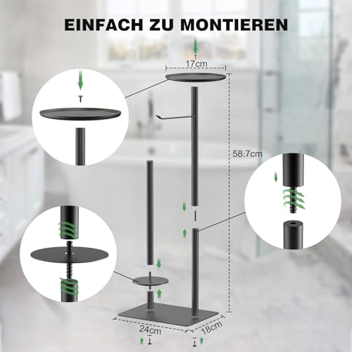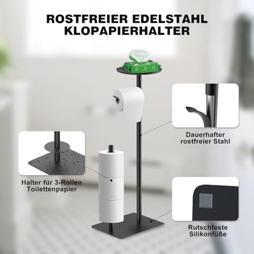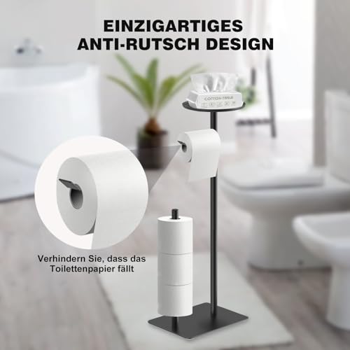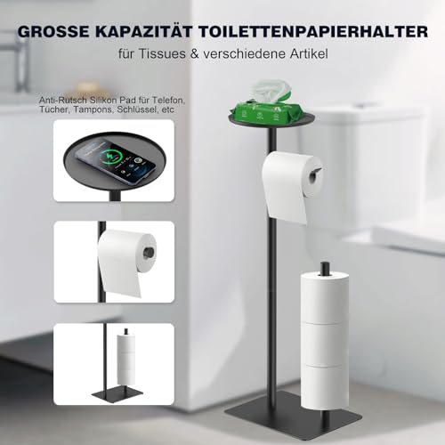 - حامل ورق تواليت مقاوم للصدأ: حامل ورق المرحاض القائم مصنوع من الستانلس ستيل 304 المتين، مقاوم للصدأ والعفن. توجد أربع وسادات سيليكون غير قابلة للانزلاق في الجزء السفلي من القاعدة لمنع الخدوش على الأرض..