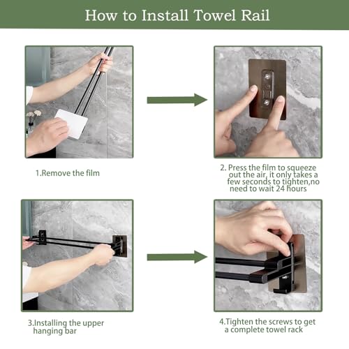 - 【سهل التركيب】حامل المناشف ذاتي اللصق هذا سهل التركيب للغاية، بدون ثقب، بدون أدوات، لا يسبب ضررًا للجدار، التصاق قوي، ليس من السهل نزعه. يرجى الانتباه إلى أن حامل المناشف هذا يعمل بشكل جيد على سطح أملس ومستوٍ، مثل البلاط والزجاج والمعدن والرخام وبلاستيك PVC المسطح وما إلى ذلك، عند الاستخدام، اضغط على الهواء من الملصق واحفظه بعيدًا عن طبقات البلاط