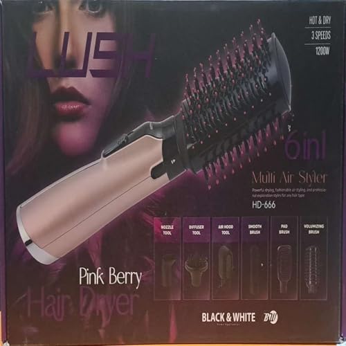Generic - مجفف شعر بلاك اند وايت متعدد الوظائف 6 في 1، 1200 واط، 3 سرعات، ساخن وبارد، وردي، موديل HD-666، يشمل 6 ملحقات