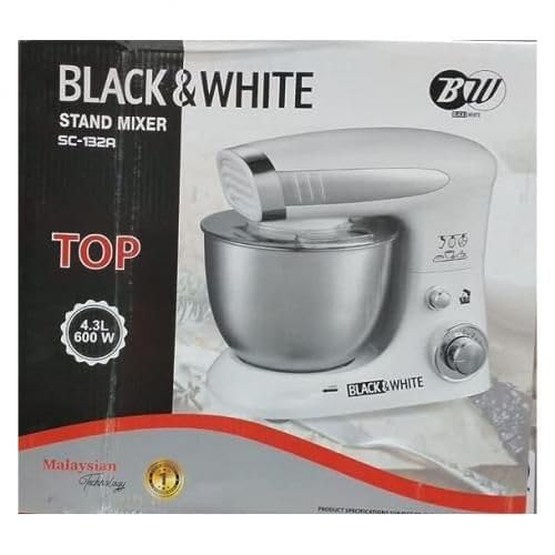 Black & White - خلاط عجين 600 واط سعة 4.3 لتر يتميز بـ6 سرعات من بلاك اند وايت، بلون أبيض، SC-132A