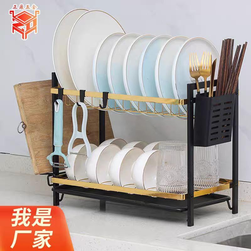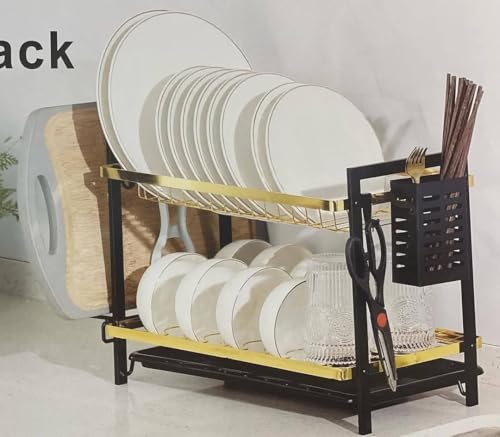 Generic - مطبقية مطبخ معدن أسود × جولد – 2 دور بتصميم أنيق – حامل معالق وشوك + حامل قطاعة – تصميم عملي لتجفيف وتنظيم الأطباق