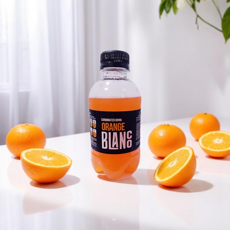 - التعبئة: تصميم زجاجة بلاستيكية شفافة تعرض اللون البرتقالي مع علامة تجارية حديثة بالأبيض والأسود