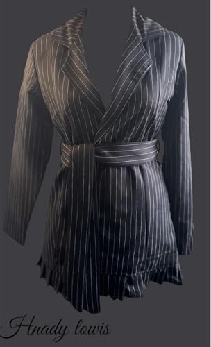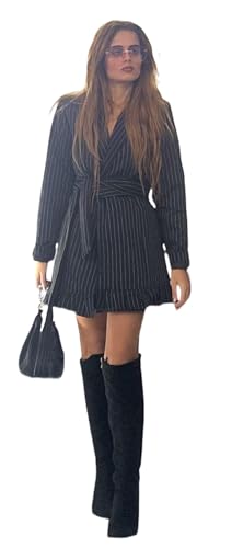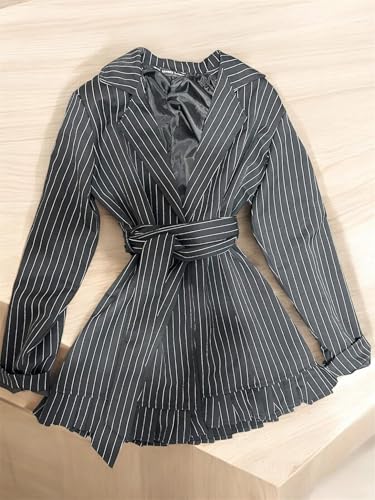 Generic - فستان بليزر قصير مخطط بأكمام طويلة، ونمط ملفوف بحزام وحافة مكشكشة، لون أسود وأبيض