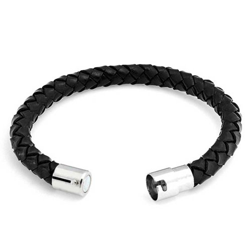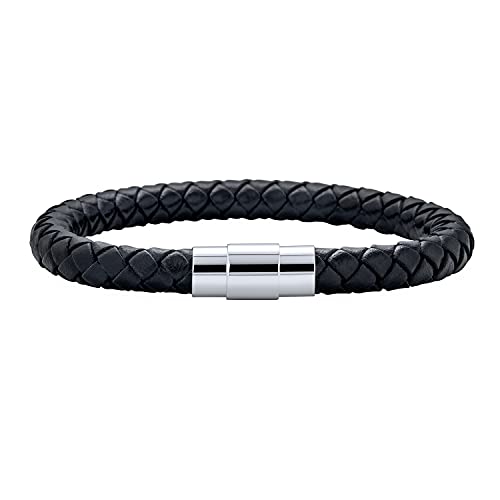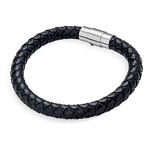 Bling Jewelry - بلينج جويليري سوار مضفر من الجلد الطبيعي الاسود للرجال والمراهقين والنساء مشبك اسطواني مغناطيسي للجنسين 8.5 بوصة جلد بدون احجار كريمة