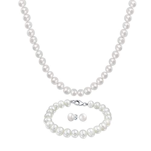 Bling Jewelry - طقم مجوهرات للنساء مكون من 3 قطع يتضمن سلسلة وسوار وحلقان كلها مرصعة باللؤلؤ المستخرج من المياه العذبة بلمعة لون قزحي, One Size، أبيض، ال اي سي، من بلينج جوليري