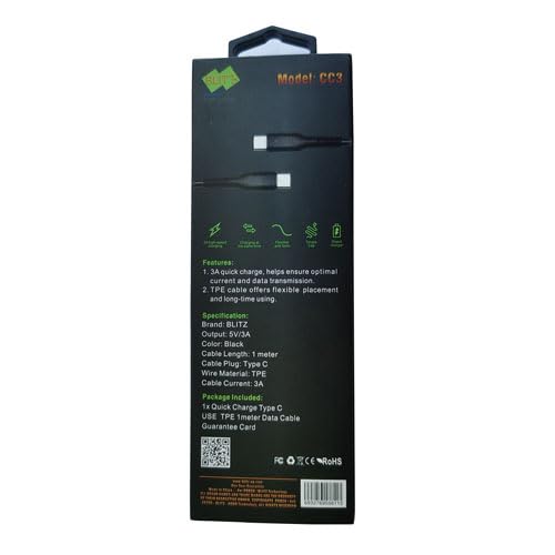 BLITZ - كابل شحن سريع بليتز ثري ايه من USB-C إلى USB-C (1 م/ 3.3 قدم)، دعم PD بقوة 100W، ونقل بيانات بسرعة 5Gbps لأجهزة ماك بوك، اي باد برو وجالاكسي S23 وبيكسل 7 – تصميم متين مع غلاف نايلون مضفر (أسود).